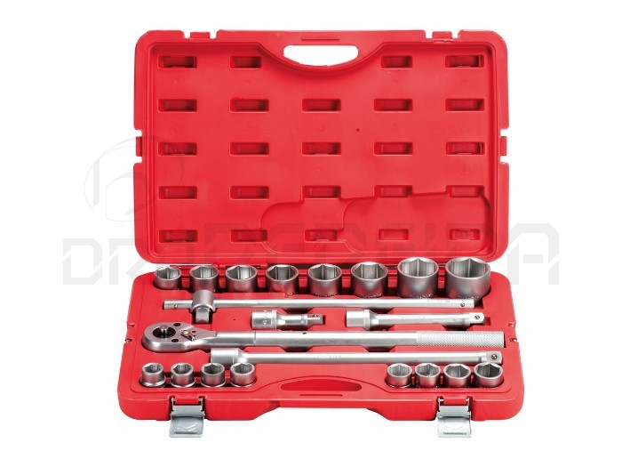 VER CARACTERÍSTICAS Jogo chaves de caixa 3/4" com 21 peças. Chaves 19mm, 21mm, 22mm, 23mm, 24mm, 26mm, 27mm, 29mm, 30mm, 32mm, 35m, 36mm, 38mm,, 41mm, 46mm, 50mm 3 extensões caixa Cr-V 3/4" 100mm, 200mm, 400mm Tê força caixa cr-V