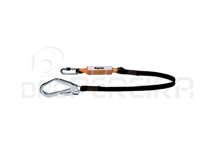 Cabo anti-queda absorvente de energia com cinta de poliamida de 32 mm e invólucro de contenção capaz de reduzir a força de impacto durante uma queda.